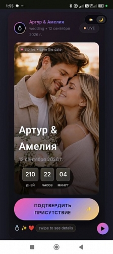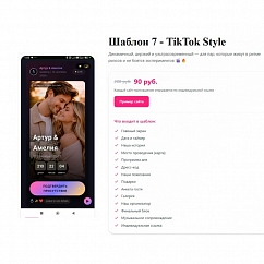 TikTok Style — это ультрасовременный сайт для пар, которые не мыслят себя без социальных сетей, трендов и вирусного контента. Дизайн вдохновлен интерфейсом популярных платформ: вертикальная прокрутка, крупные акценты, динамичные переходы и место для ваших лучших видео. Если вы хотите удивить гостей нестандартным подходом и показать, что идете в ногу со временем — этот шаблон создан для вас.