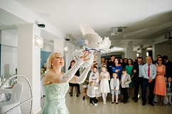 Я предлагаю очень романтический номер с белоснежными голубями. Существует поверье, что в день свадьбы необходимо прикоснуться к белоснежному голубочку, загадать желание и выпустить голубя на свободу. Теперь у вас есть такая возможность, не выходя из помещения, и ваше желание обязательно сбудется. В представлении-номер с дрессированными голубями, незабываемое фото молодоженов с птицами , танец, предсказание на дальнейшую судьбу, загадывание желания и запуск голубей. Длительность около 10-15 минут. Сделайте подарок себе на свадьбу или близким тебе и дорогим людям.